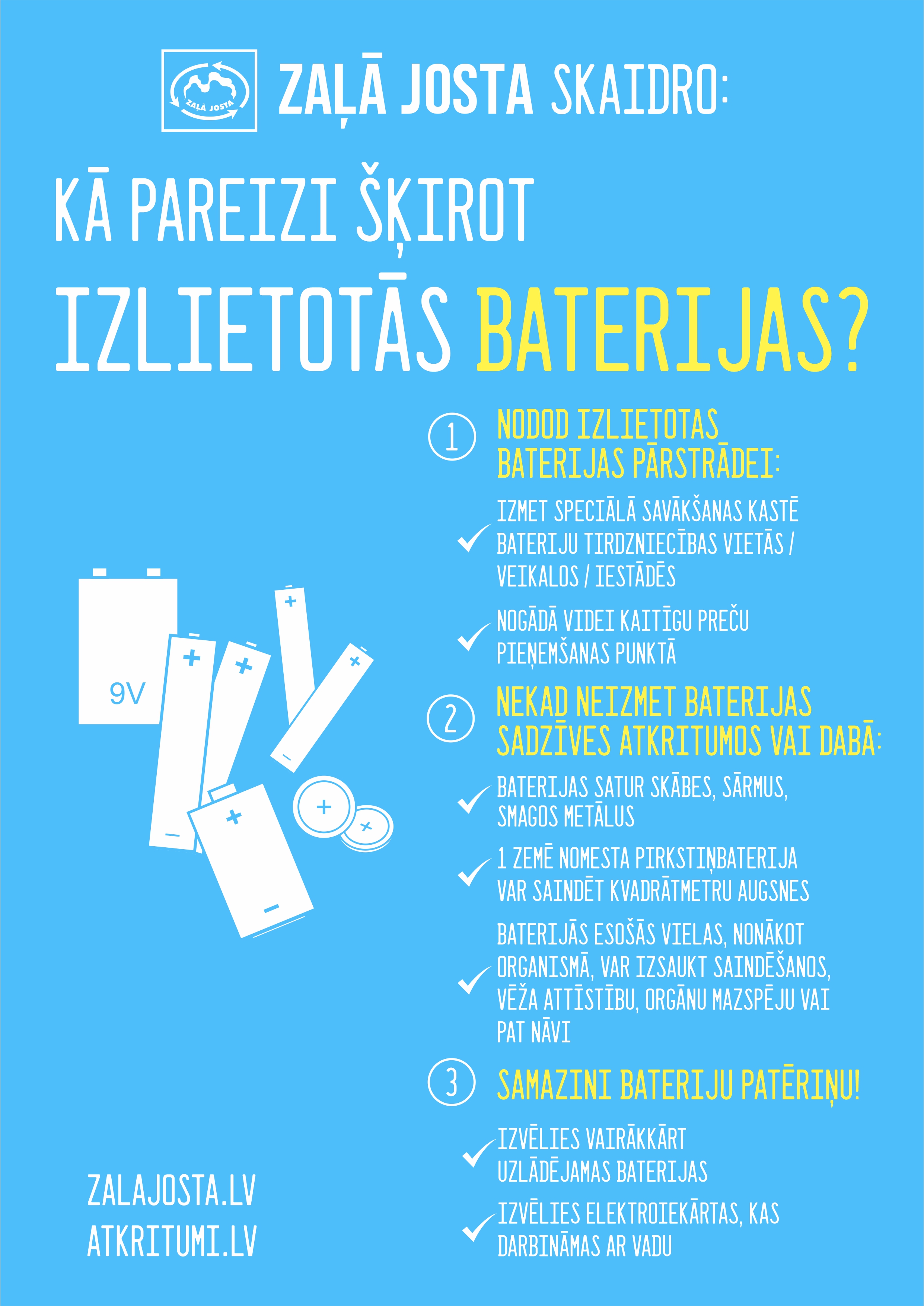 “Izlietotas baterijas ir videi kaitīgi atkritumi, kuru dalīta vākšana un pārstrādes nodrošināšana ir ne tikai nozīmīga no vides saudzēšanas viedokļa, bet arī ļauj atgūt virkni vērtīgu otrreizējo izejvielu!